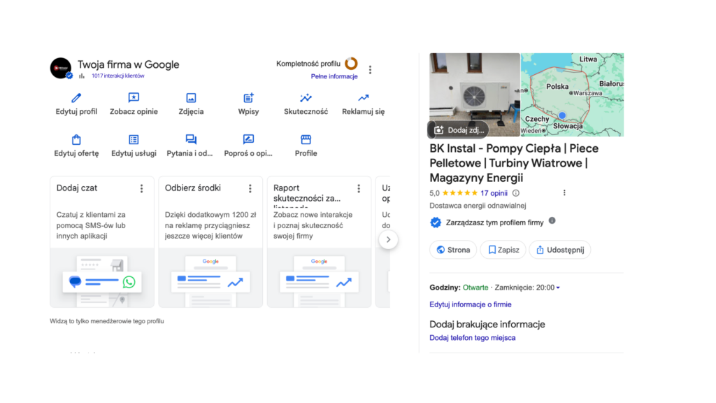 Czy wiesz, że klienci coraz częściej sprawdzają firmy z branży OZE w internecie, zanim zdecydują się na podjęcie decyzji zakupowej? Wizytówka Google to dziś jedno z głównych miejsc, w którym buduje się zaufanie do wykonawcy – właśnie tam klienci weryfikują opinie, realizacje i wiarygodność firmy. Dbamy o widoczność i pozycjonowanie wizytówki Google tak, aby pracowała na Twoją sprzedaż, zwiększała liczbę zapytań i wzmacniała zaufanie już na spotkaniu handlowym.